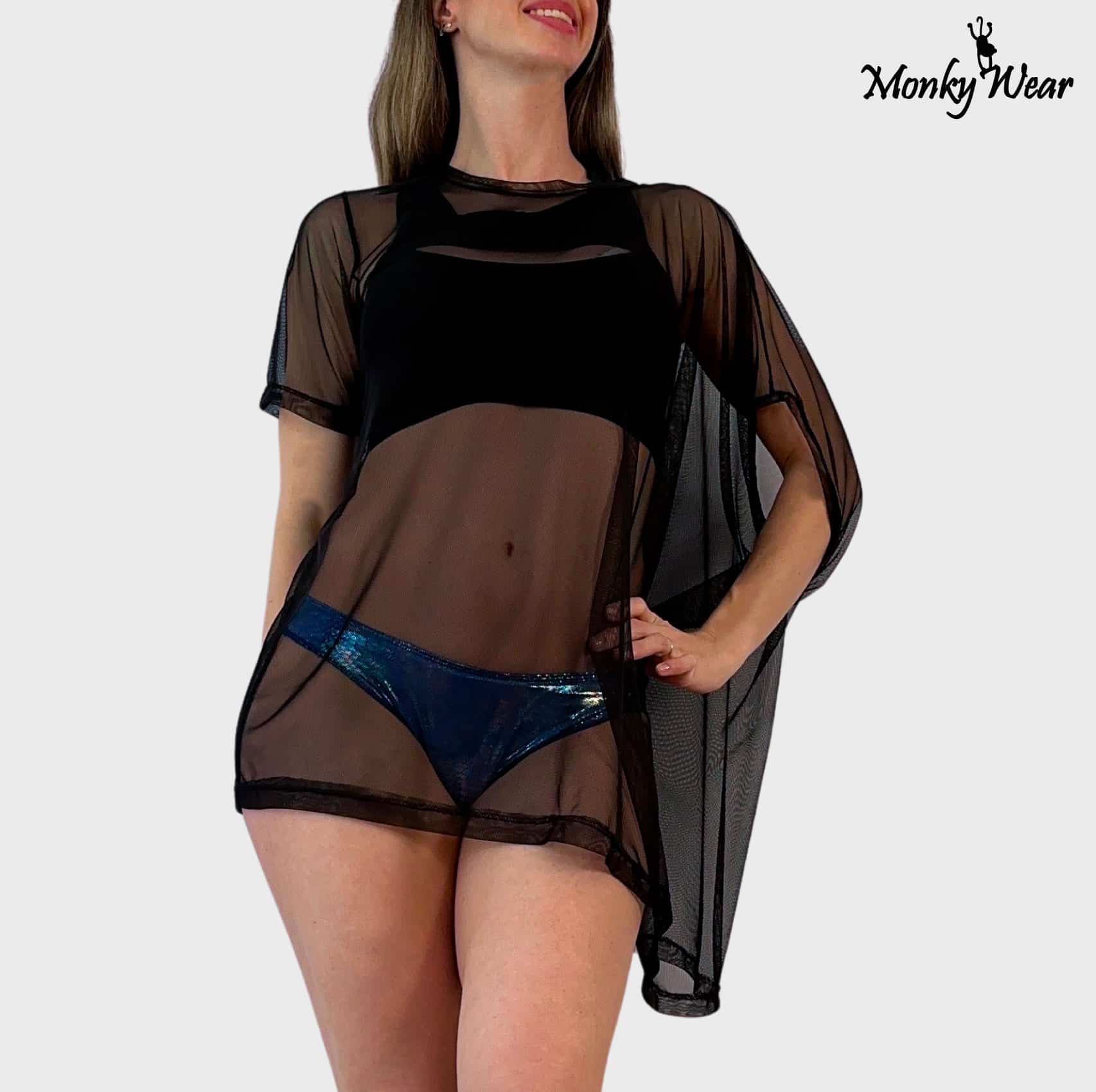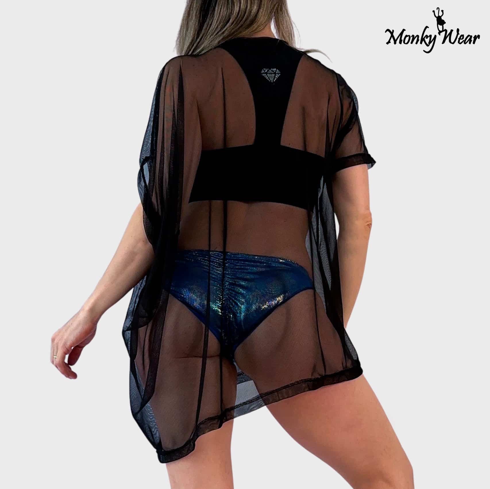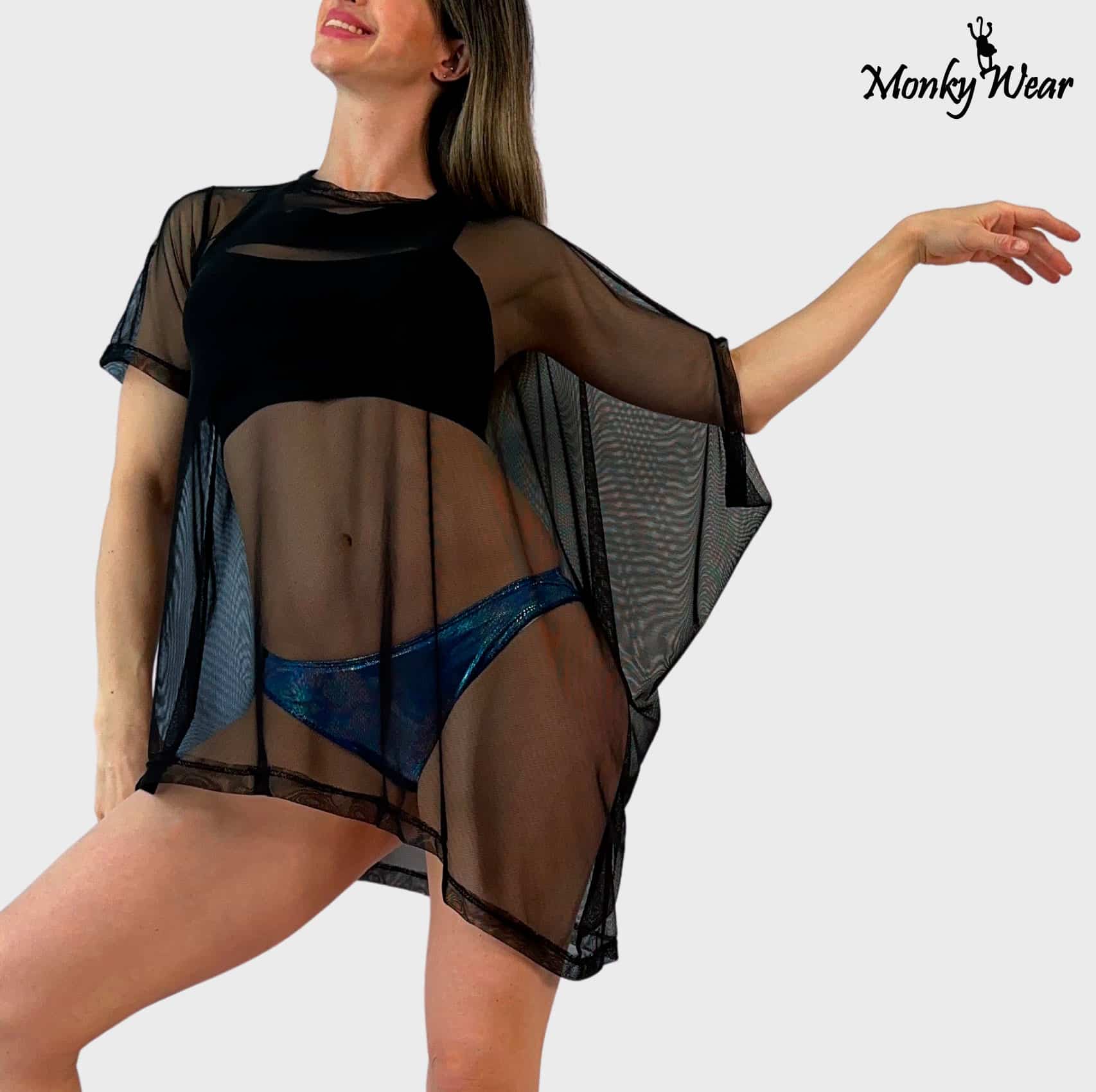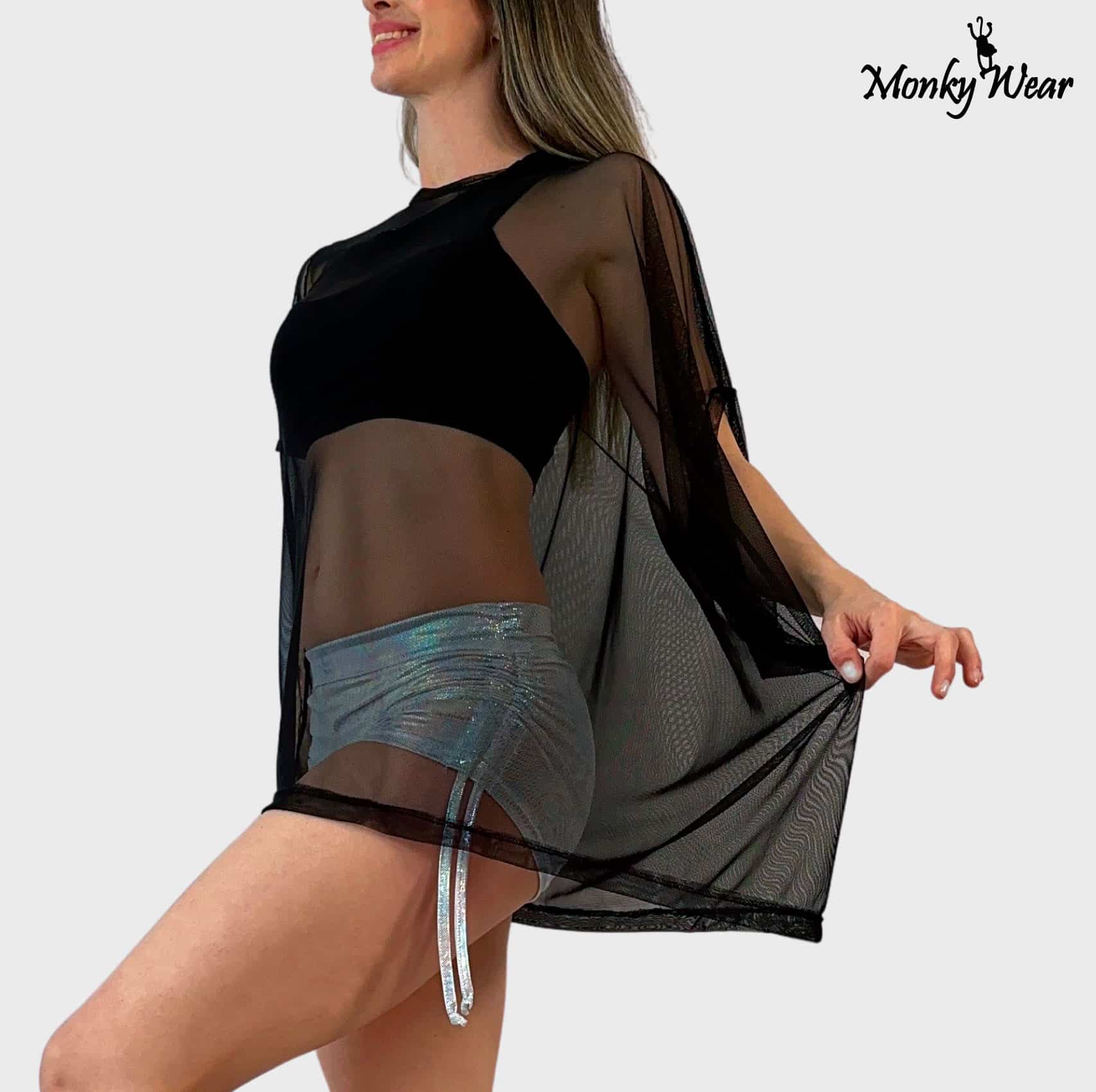 Blusón fabricado en mesh negro elástico traslúcido y suave. Aplicación de logo reflejante en el hombro.