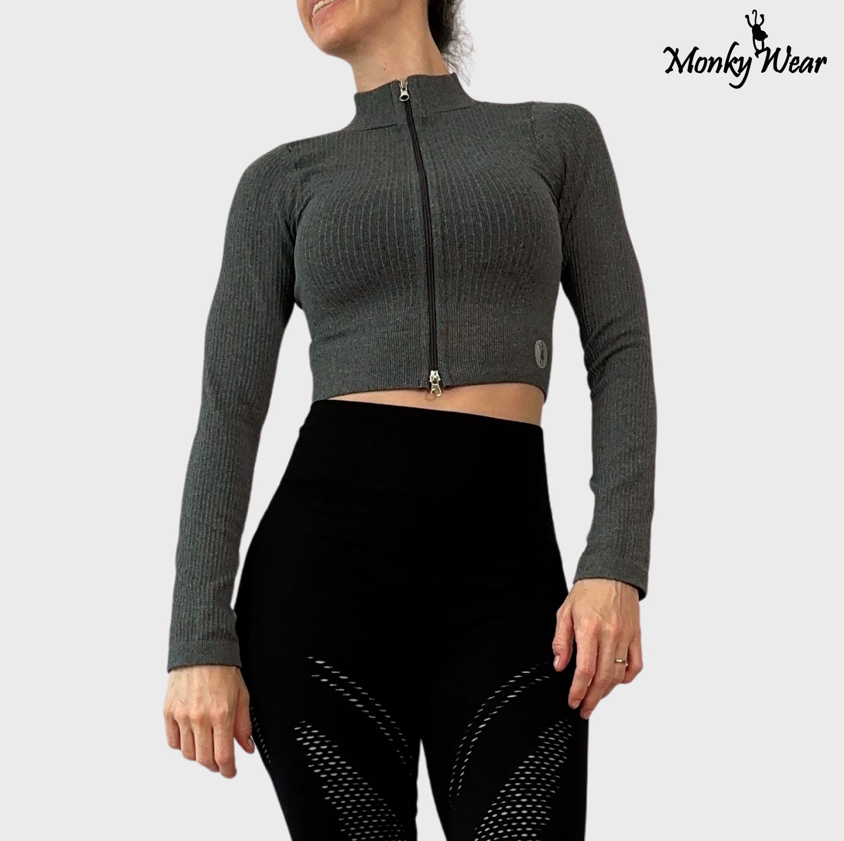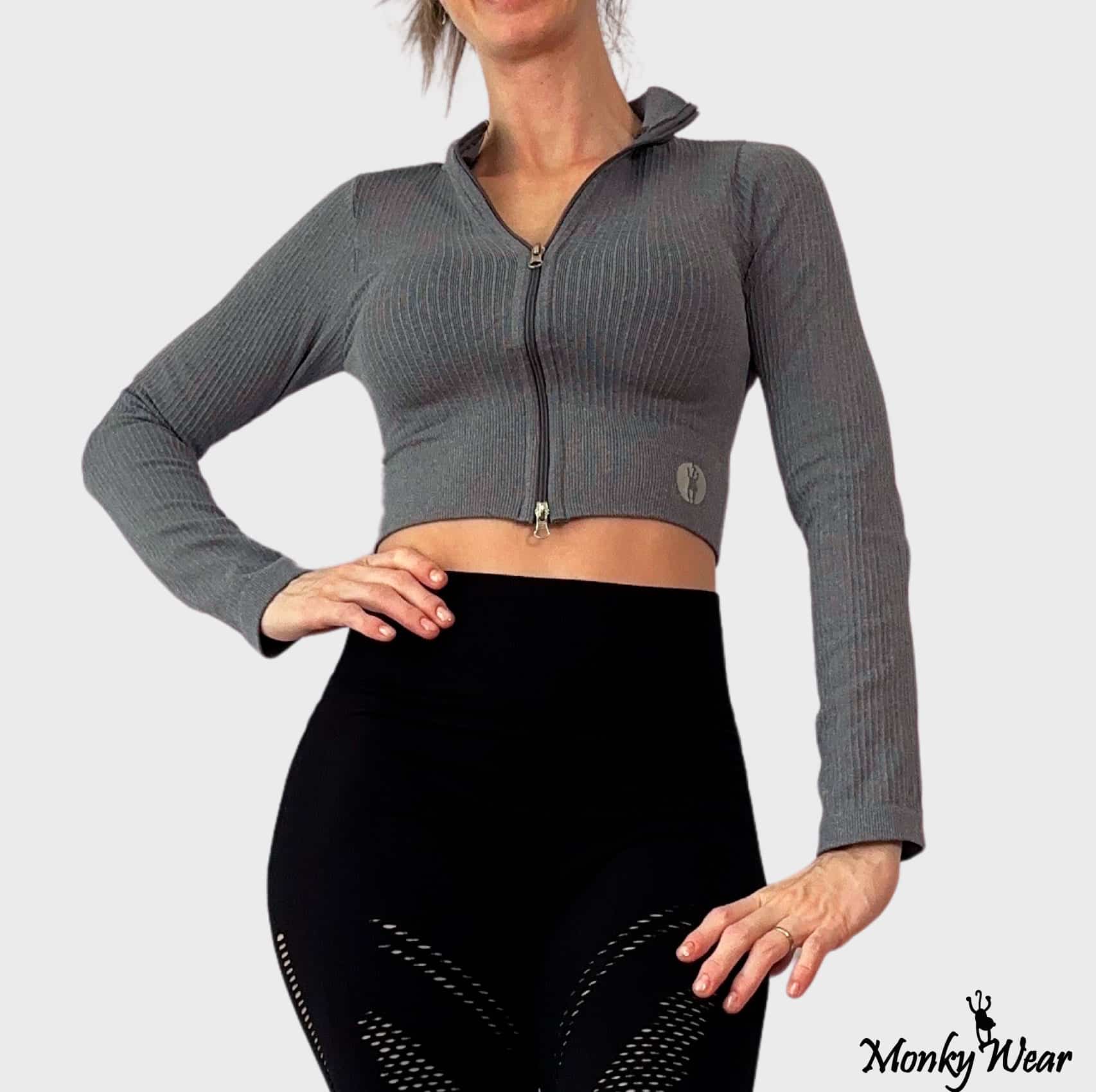 Chamarra con cierre ornamental al frente (no se separa de la parte inferior), fabricada en color gris en dos tonalidades.