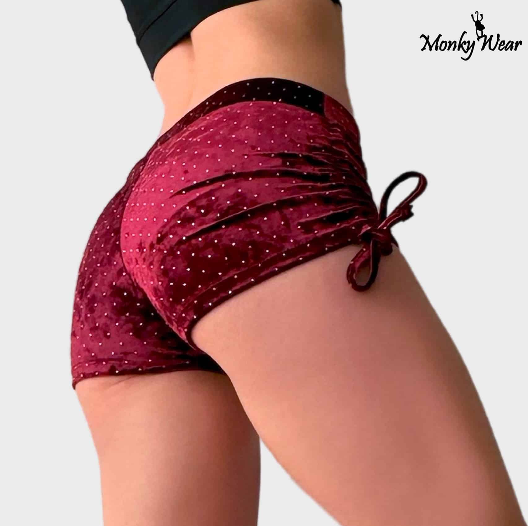 Short fabricado en terciopelo de importación coreano en tono vino con aplicaciones doradas.