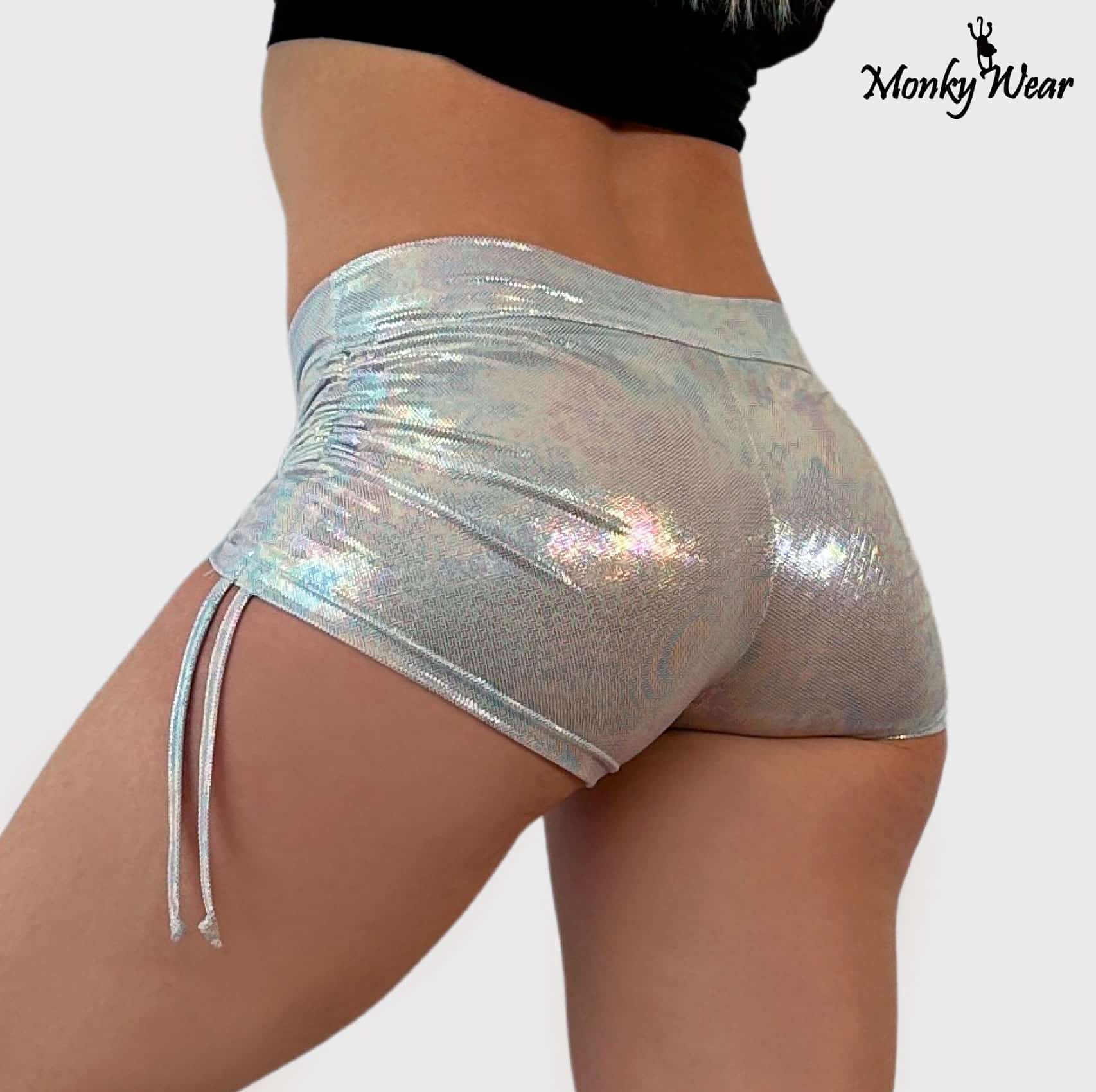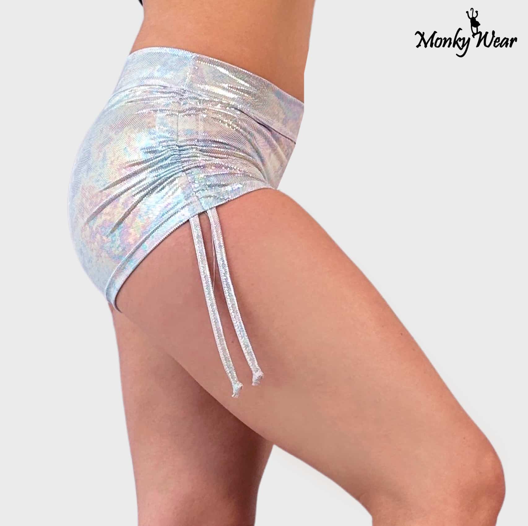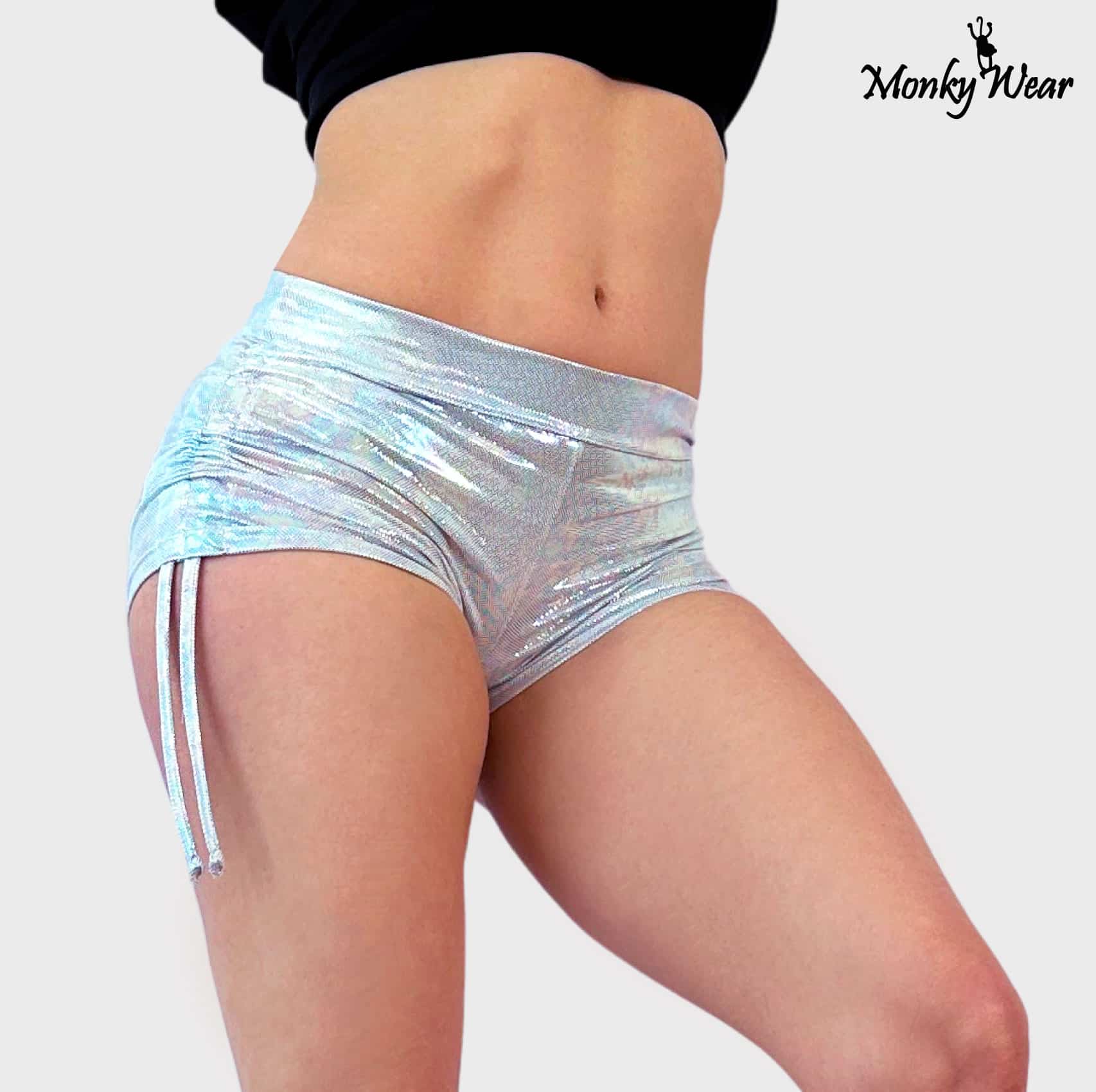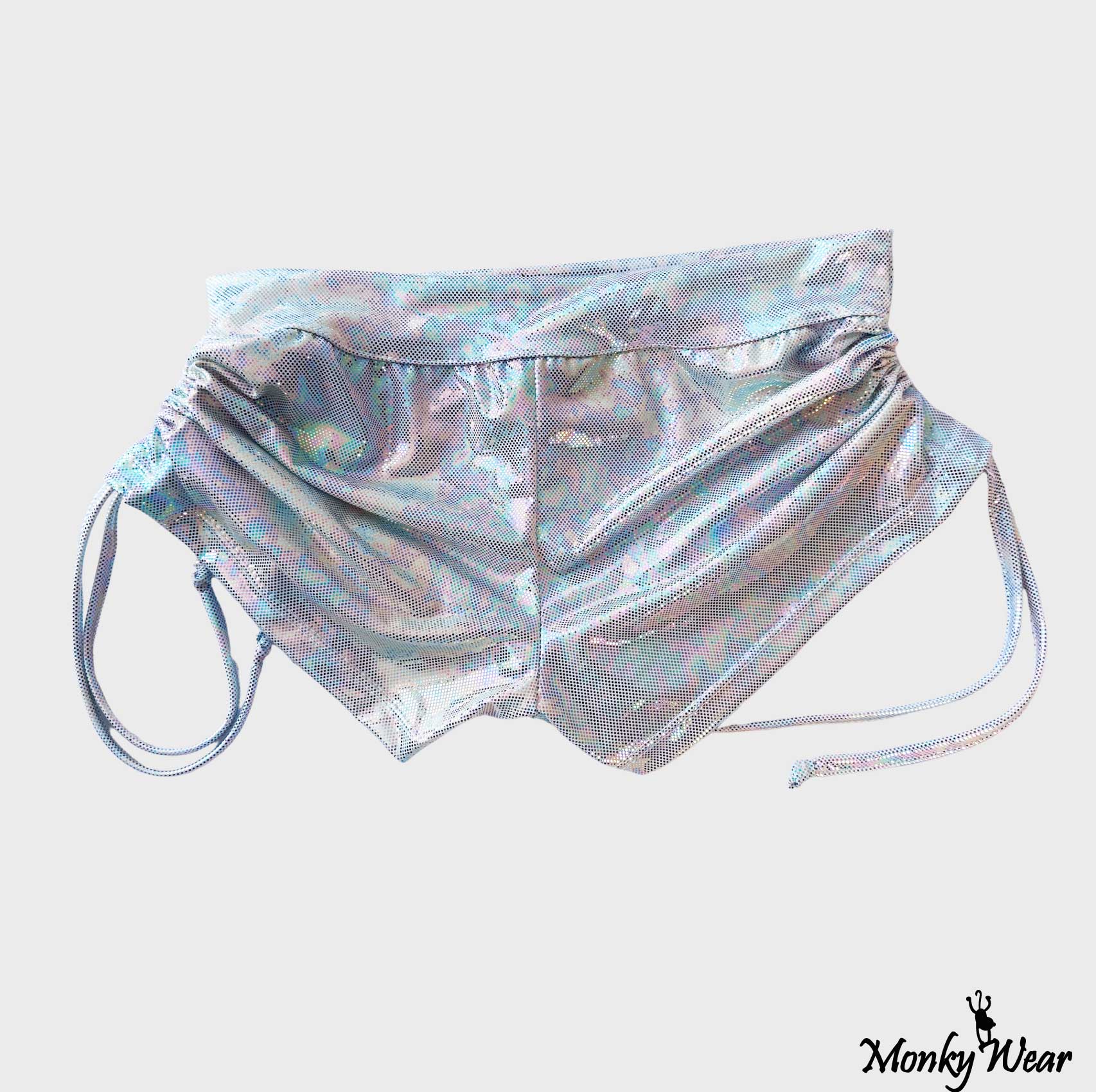 Short fabricado en lycra de importación coreana con aplicaciones en brillo holográfico en la parte superior.