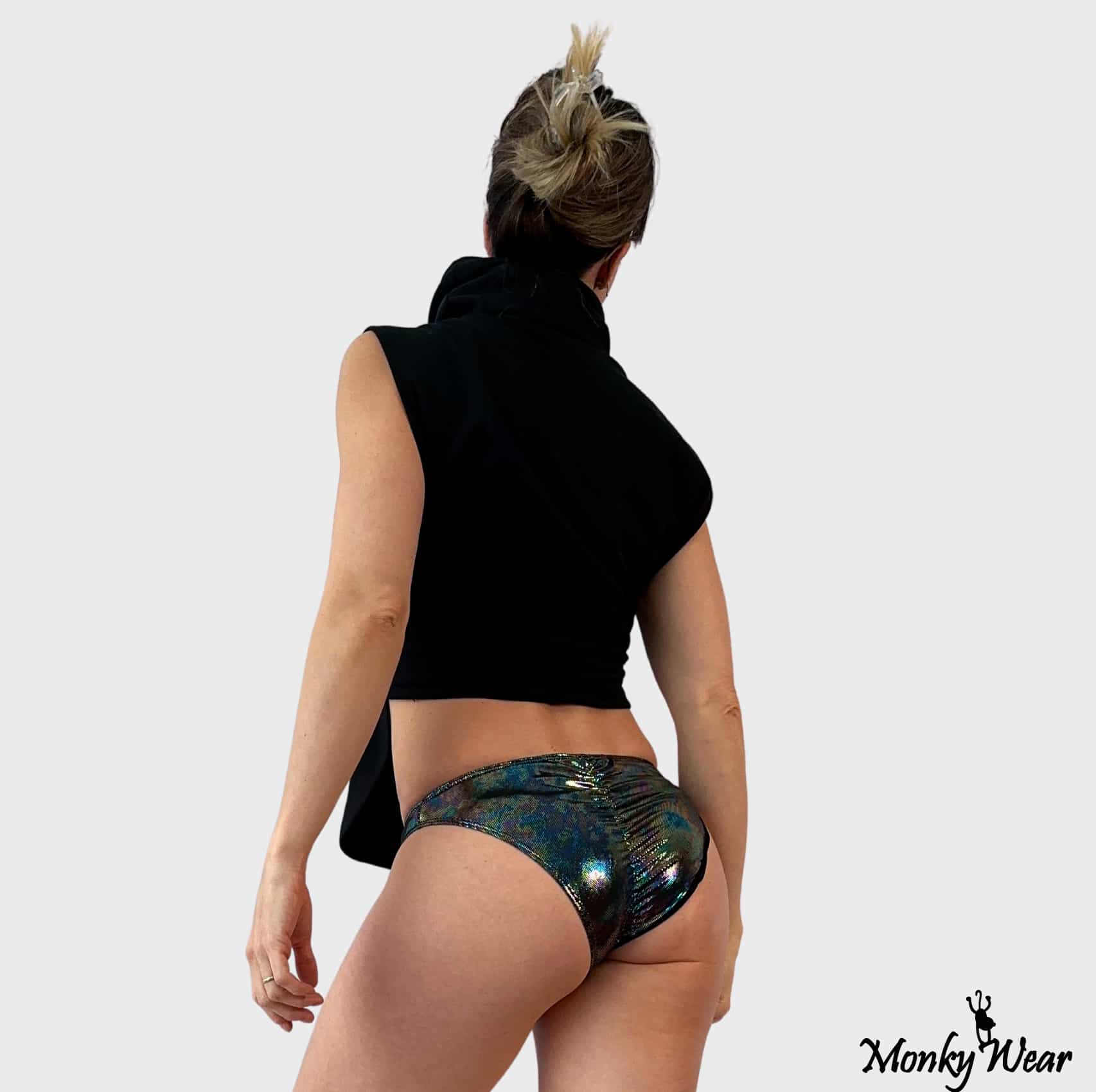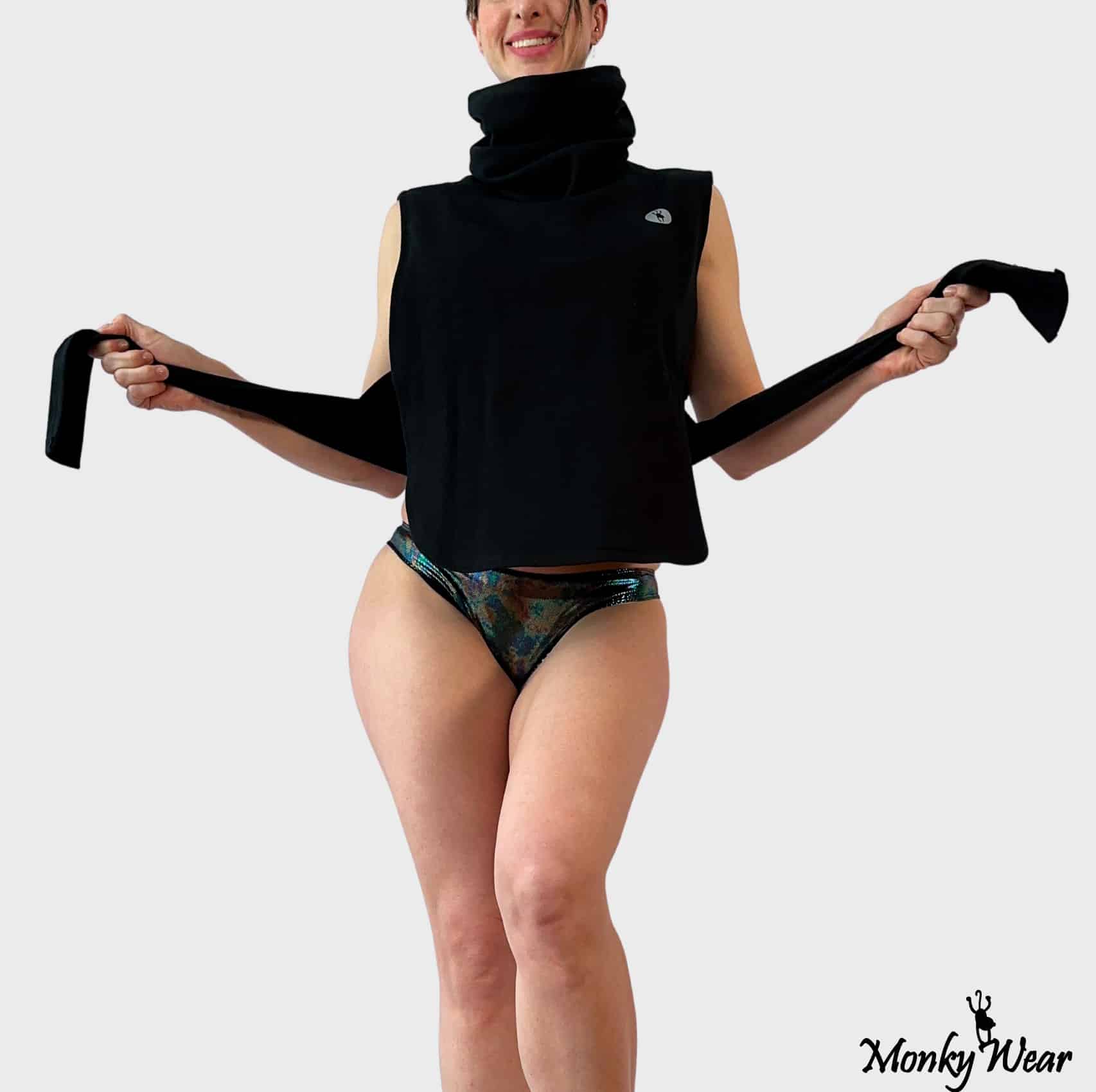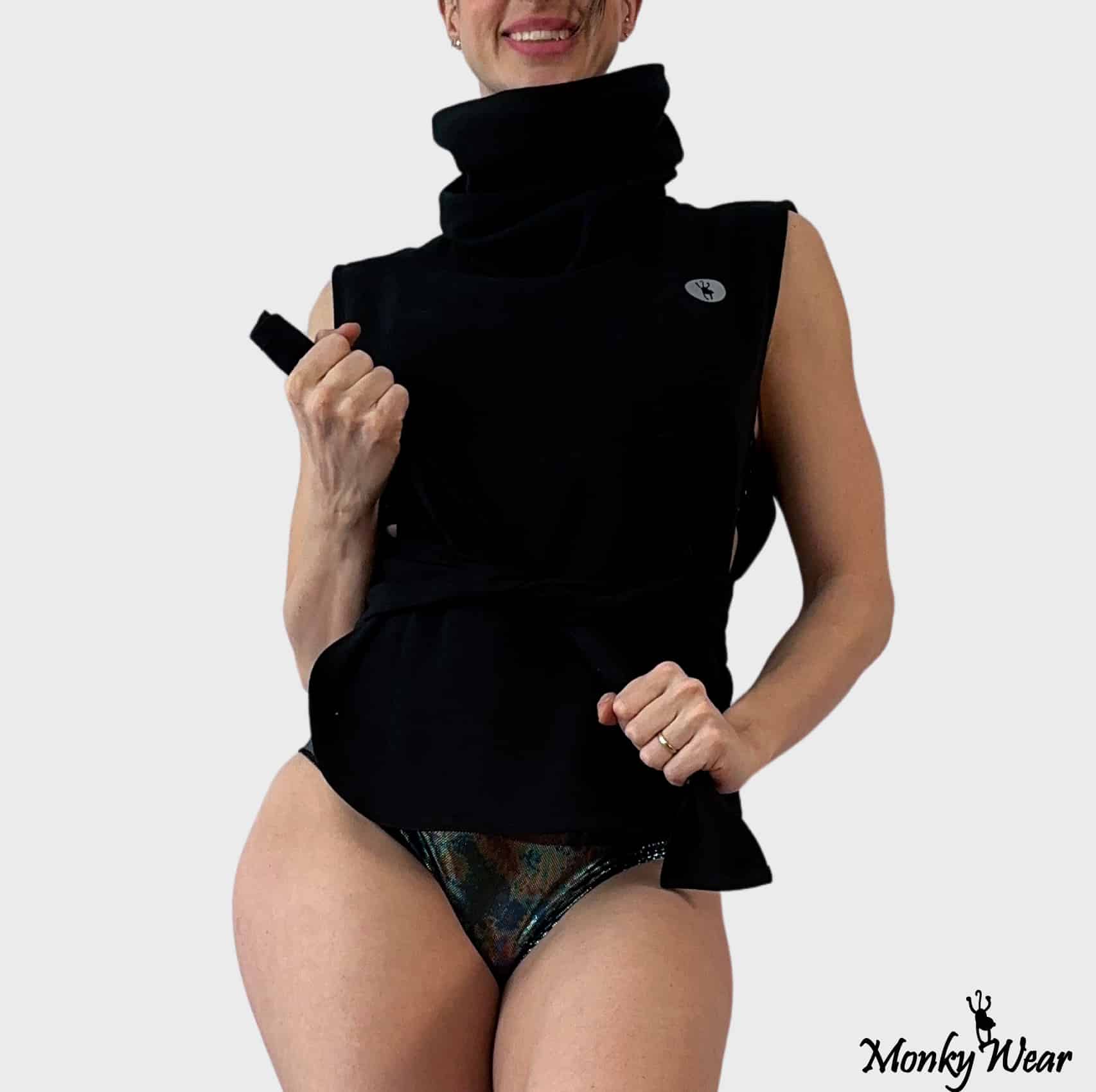 Sudadera abierta de los laterales con cordón al frente para amarrar. Fabricada en tela de algodón y poliéster calientito y con cobertura interna tipo polar. Color negro.