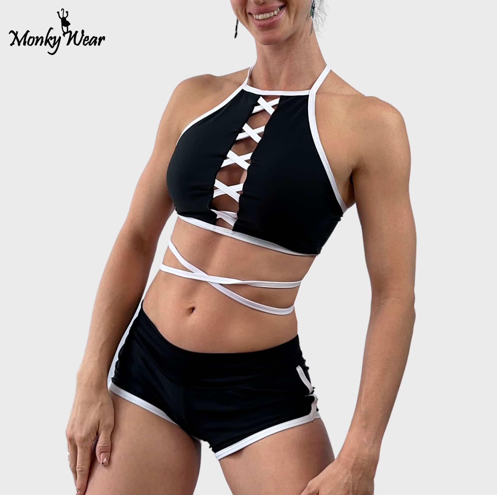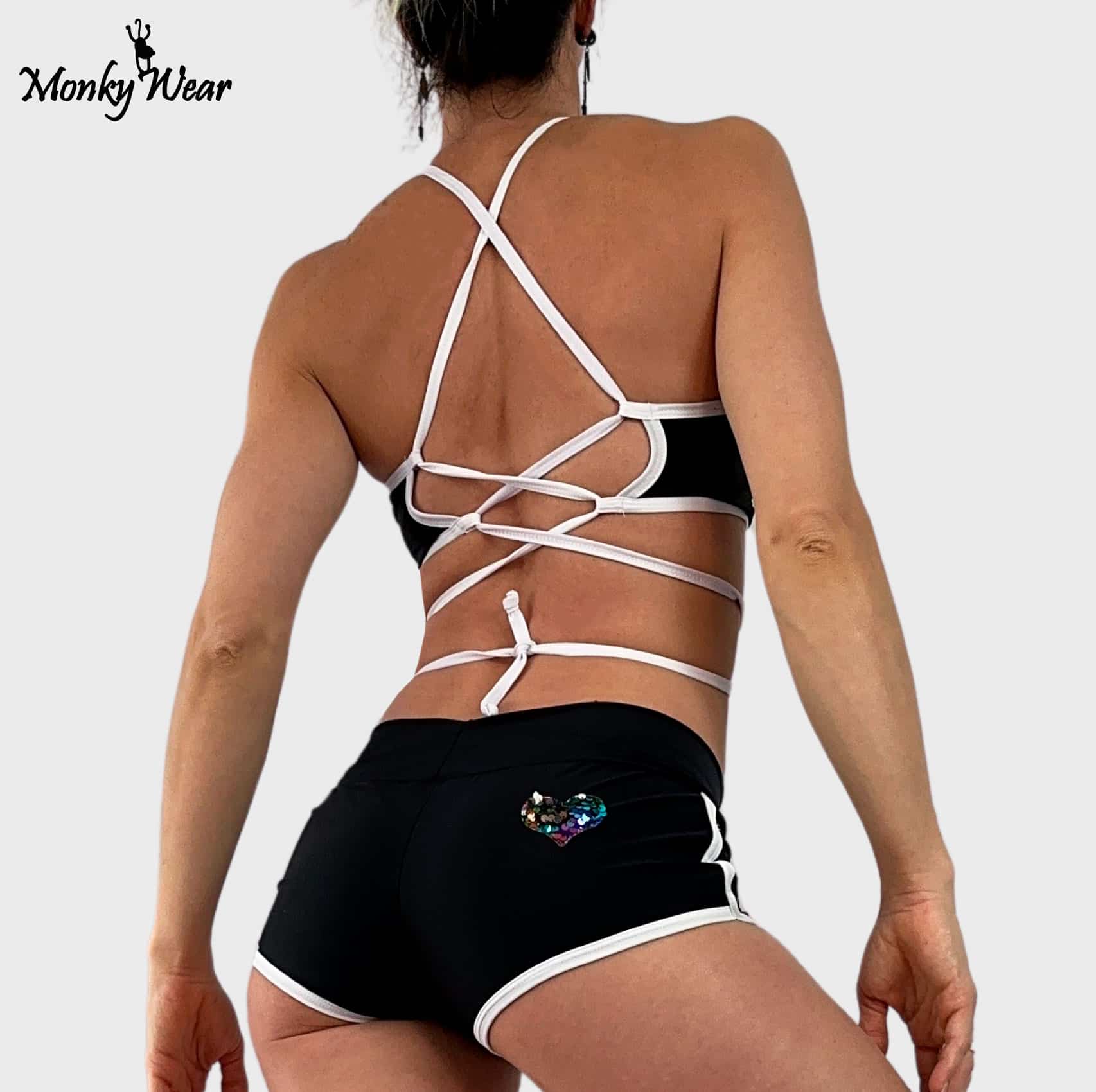 Top en diseño Criss Cross fabricado en lycra color negro con jaretas en tono blanco para cruzar al rededor del cuerpo.
